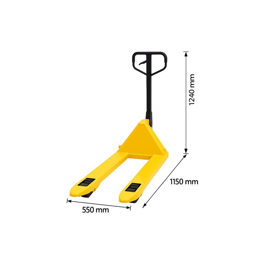 Здрава и надеждна ръчна палетна количка, изработена от висококачествени материали, предназначена за ежедневна работа в складове, магазини и производствени помещения.